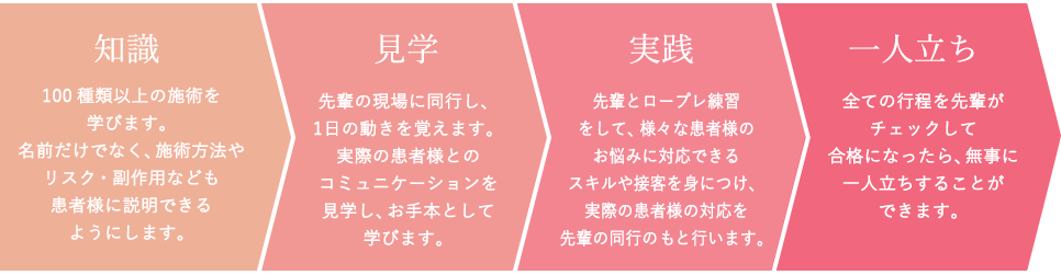 美容医療が未経験でも大丈夫!研修制度があるので、学ぼうとする気持ちがあれば問題ありません。また、次のステップとしてクリニックを管理する“クリニックマネージャー”を目指すことも可能です。